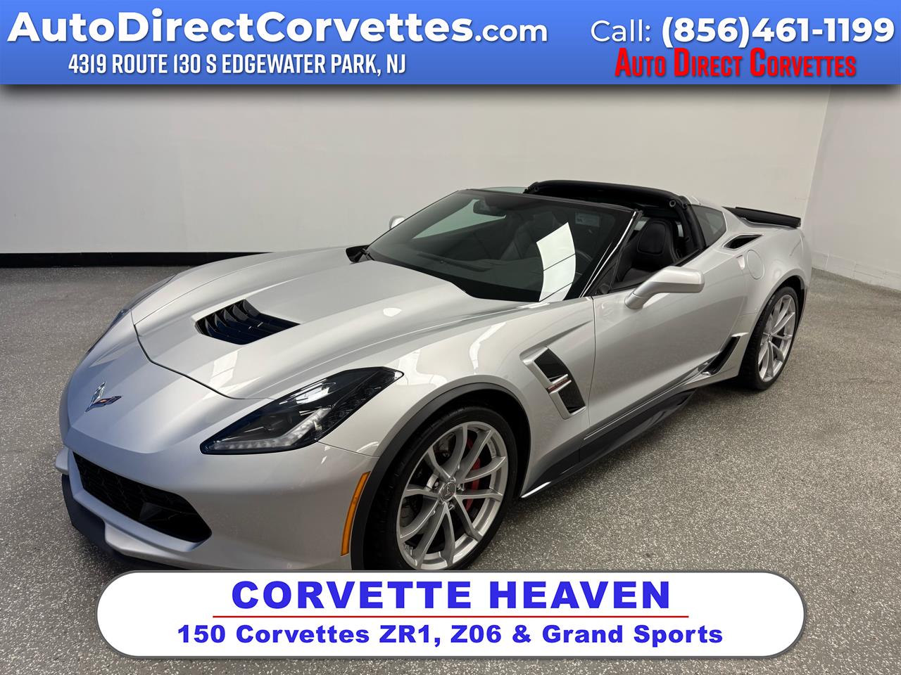 *****Extremely rare find garage kept 2019 Corvette Grand Sport Coupe only 2K original miles****Auto Direct is the #1 PreOwned Corvette Destination, we Buy- Sell-Trade & Finance Pristine Corvettes This 2019 Chevrolet Corvette Grand Sport automatic 2-dr coupe is a must see! Carfax certified only 2,524 miles in pristine condition and performs perfectly. Blade Silver Metallic exterior with Jet Black leather interior. Loaded with all factory options featuring paddle shifters, remote start, Onstar capability, back up camera, performance exhaust, apple carplay/ android auto, magnetic selective ride control, and more. A must see and drive to appreciate this tremendous value. Buy with confidence from New Jersey's #1 rated dealer 10 years in a row, 3 generations family owned and operated, and over 70 years delivering the highest level of customer satisfaction. Awarded 2022 Mid- Atlantic Regional dealer of the year. Trade-ins welcome. Stop by and visit our huge indoor showroom showcasing hundreds of pristine corvettes, trucks, luxury imports, sports cars, and convertibles. Get pre-approved financing with lowest rates available, payments are based on bank deal structure. For all factory options please click above to view the new-car sticker. Ask about extended service warranty coverage. At Auto Direct we say, why buy new? If you can't tell the difference, why pay the difference!Visit Auto Direct Corvettes online at autodirectcorvettes.com to see more pictures of this vehicle or call us at (856)461-1199 today to schedule your test drive. Auto Direct is located on route 130 S. Edgewater Park, NJ. (856)461-1199.